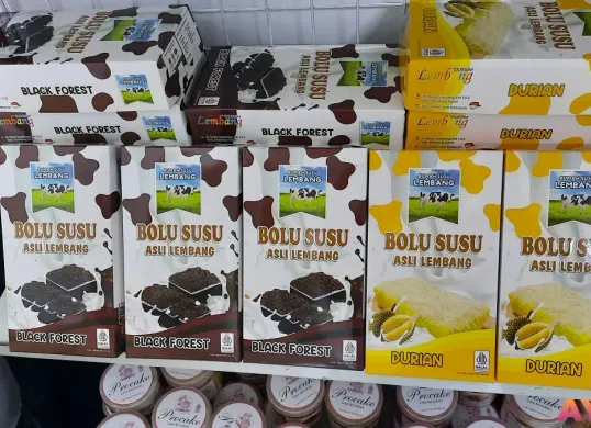 Bolu Susu Asli Lembang menawarkan beragam varian bolu yang menggoda selera. Mulai dari rasa original, tiramisu, black forest, hingga varian durian yang menjadi primadona di etalase pameran.
