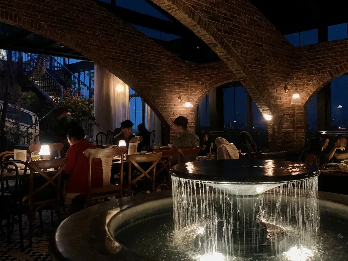 Malam itu menghadirkan suasana yang syahdu. Lampu-lampu temaram memantul di dinding bata merah, sementara bunyi lembut air mancur mengiringi percakapan santai para pengunjung. Dari meja ke meja, aroma kopi dan rempah berpadu dengan tawa kecil, menciptakan harmoni yang hangat di kafe bernuansa klasik di kawasan Jl. Pasir Kaliki No. 176, Pasir Kaliki, Kecamatan Cicendo, Kota Bandung (01/11/2025).