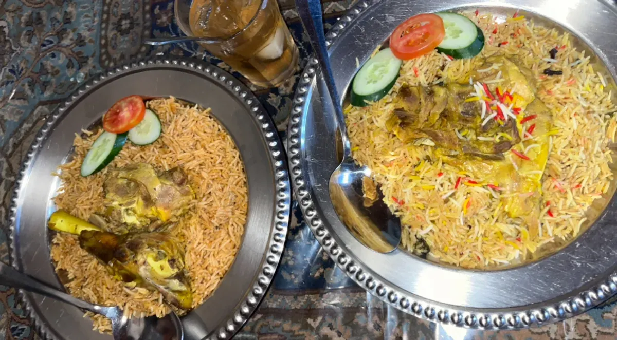 Kabsah Lamb hadir dalam piring besar berbahan logam, dengan porsi yang memang dirancang untuk berbagi. Nasi panjang berwarna keemasan memenuhi hampir seluruh piring, sementara potongan daging kambing diletakkan di bagian atas. Saat penutup dibuka, aroma rempah langsung tercium. Wangi kapulaga, kayu manis, cengkeh, jintan, ketumbar, dan lada hitam berpadu dengan kaldu daging, menghadirkan aroma hangat yang khas masakan Timur Tengah.
