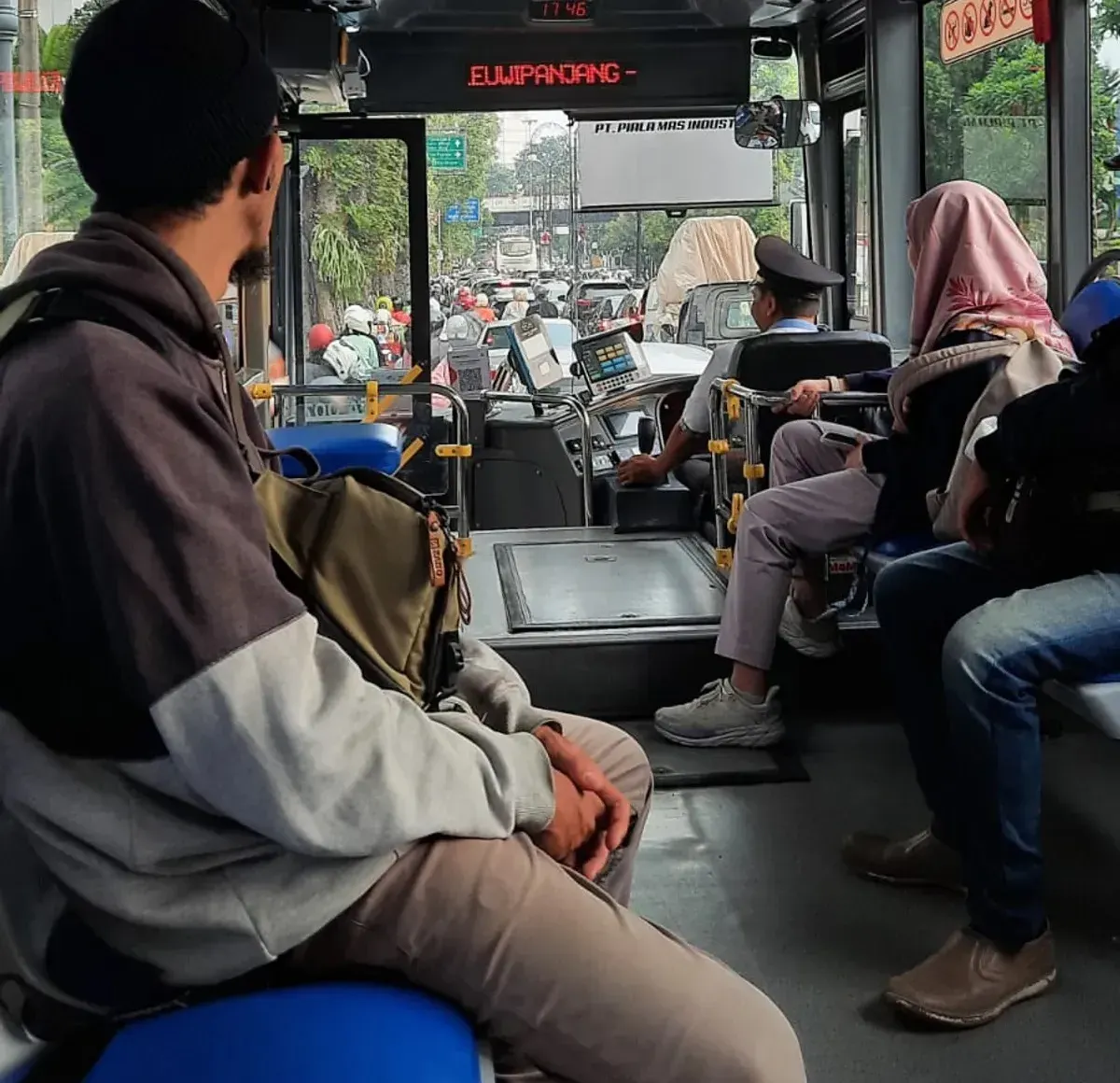 Pada 27 April 2025 lalu, penulis mengamati sekaligus mengalami secara langsung menaiki Bus Metro Jabar Trans rute Dago-Leuwipanjang. Pengamatan ini dilakukan dari dalam bus, pada saat kondisi operasional harian dengan penumpang yang beragam, sehingga memungkinkan pengamatan dalam konteks desain interior bus tidak hanya secara visual, tetapi juga melalui pengalaman tubuh; duduk, berdiri, berpindah, serta merespons dinamika kendaraan saat berjalan.