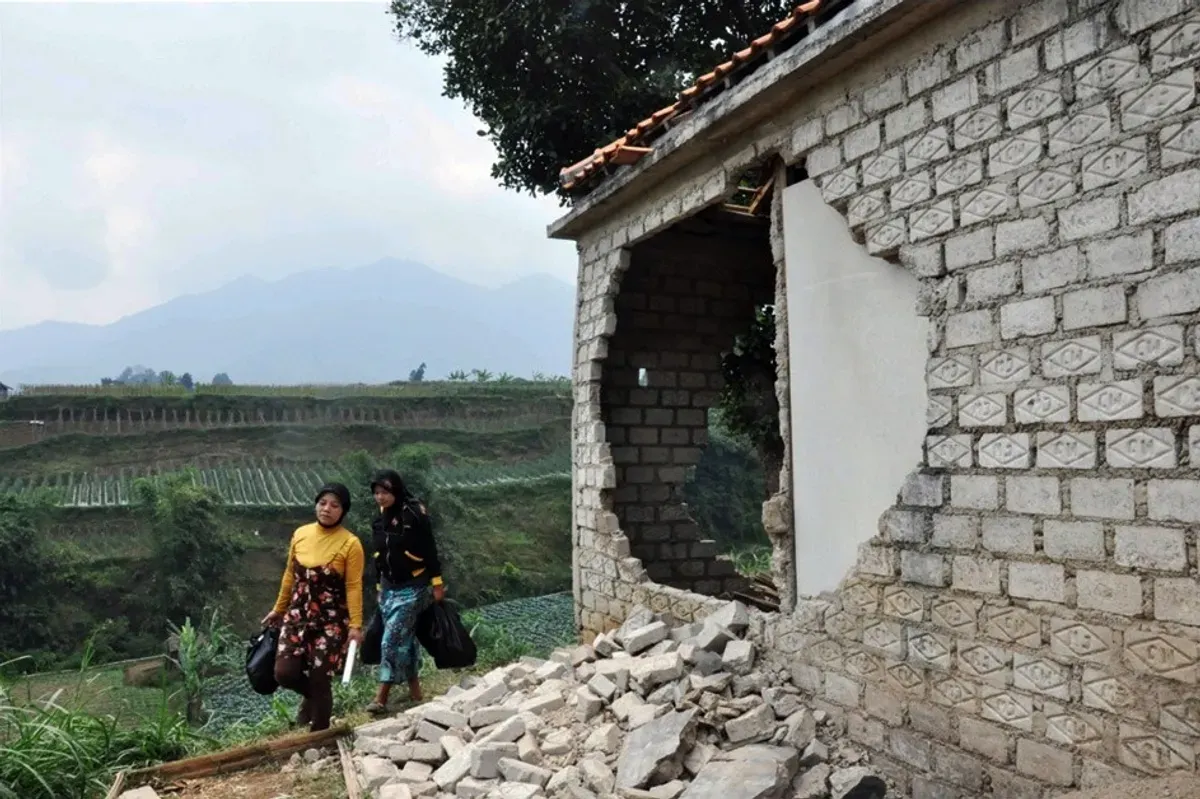 Di antara lantunan pujian keagungan, goyangan gempa bumi terjadi. Rumah-rumah yang umumnya dibangun dengan bata yang dibuat dari teras, ignimbrit dari letusan Gunung Sunda, menyebabkan adanya bagian dinding rumah yang rontok. Kerusakan rumah-rumah itu umumnya terjadi karena: pertama, sudut-sudut rumah dibangun tanpa memakai kolom beton rangka besi. Sehingga ketika ada gerakan mendorong, sudut-sudut rumah itulah yang menderita kerusakan paling parah. Atap rumah menjadi tidak ada kekuatan yang menyangga, sehingga atap rumah menjadi miring. Pemilik rumah menopang atap dengan batang-batang bambu agar tidak roboh. Kedua, rumah-rumah itu berada di sekitar garis sesar, dan ketiga di lereng atau gawir sesar.