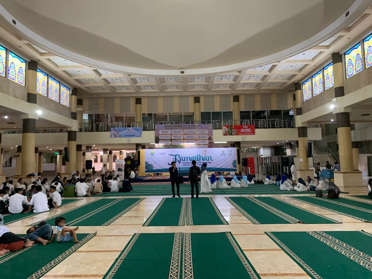 Dari arah masjid yang berdiri tepat di sisi alun-alun, suara qasidah terdengar mengalun. Sekelompok tim pengajian menabuh rebana, mengiringi lantunan salawat yang menggema di pelataran. Di bagian depan masjid, sebuah spanduk panjang bertuliskan “Safari Ramadan” terbentang menutup sebagian area dalam. Jemaah telah duduk berjajar, menunggu tausiyah dimulai sambil sesekali berbincang pelan.