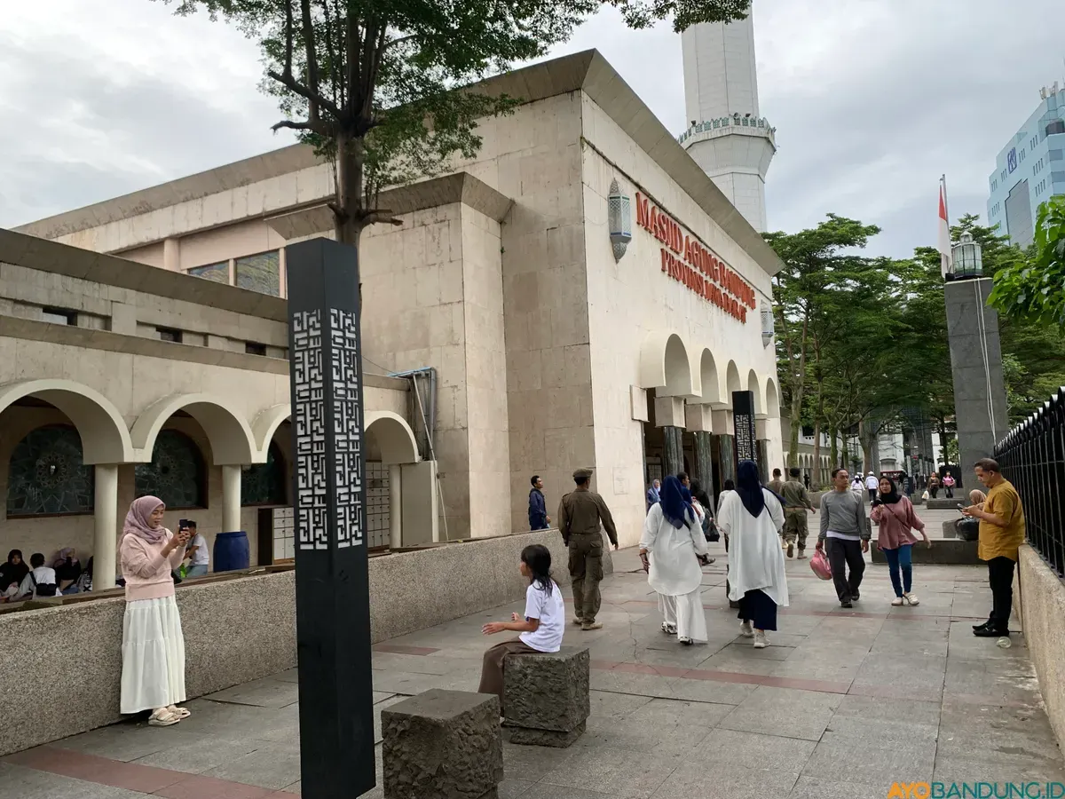 Di sekitar halaman Masjid Raya Bandung, pengunjung masih terlihat duduk di selasar, berjalan santai, atau sekadar menunggu waktu berbuka puasa. Beberapa orang memilih berteduh di bawah deretan lengkungan bangunan masjid yang ikonik, sementara yang lain menyusuri trotoar di sekitar alun-alun dengan langkah perlahan.