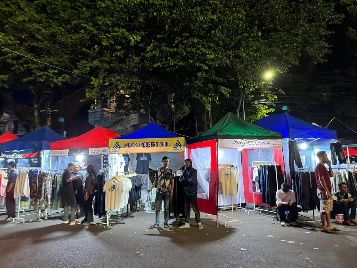 Lampu-lampu sederhana menggantung di depan lapak, menerangi gantungan baju yang berjejer rapi. Sejumlah pengunjung terlihat berhenti sejenak, menyentuh kain, menawar harga, lalu kembali melanjutkan langkah ke tenda berikutnya.