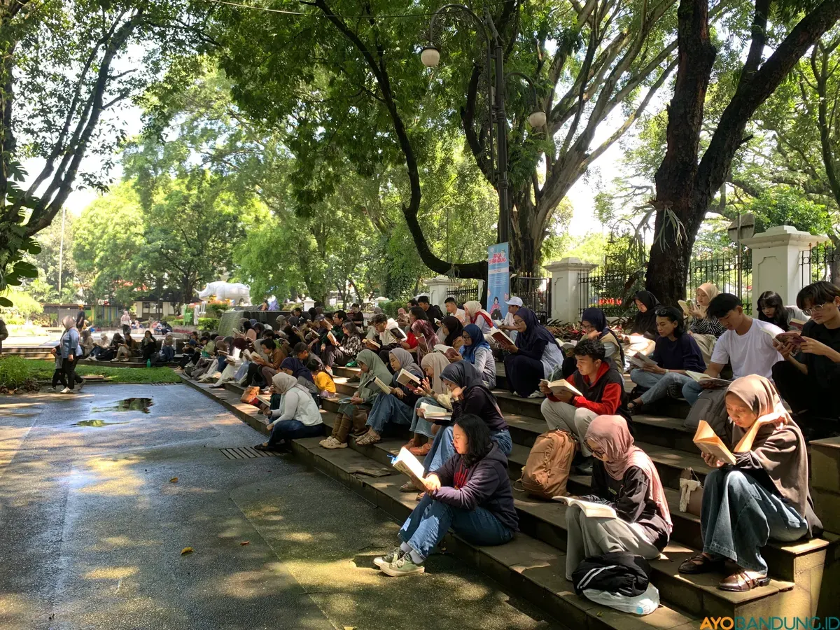 AYOBANDUNG.ID - Siang akhir pekan pada Minggu, 12 April 2026, Taman Badak di Balai Kota Bandung tidak hanya dipenuhi warga yang berjalan santai dan berteduh. Di salah satu sudutnya, puluhan orang duduk berdekatan dengan buku di tangan—baik buku fisik maupun digital. Mereka larut dalam bacaan masing-masing tanpa percakapan. Tidak ada instruksi rumit atau rangkaian acara panjang, hanya satu aktivitas sederhana: membaca bersama dalam diam.